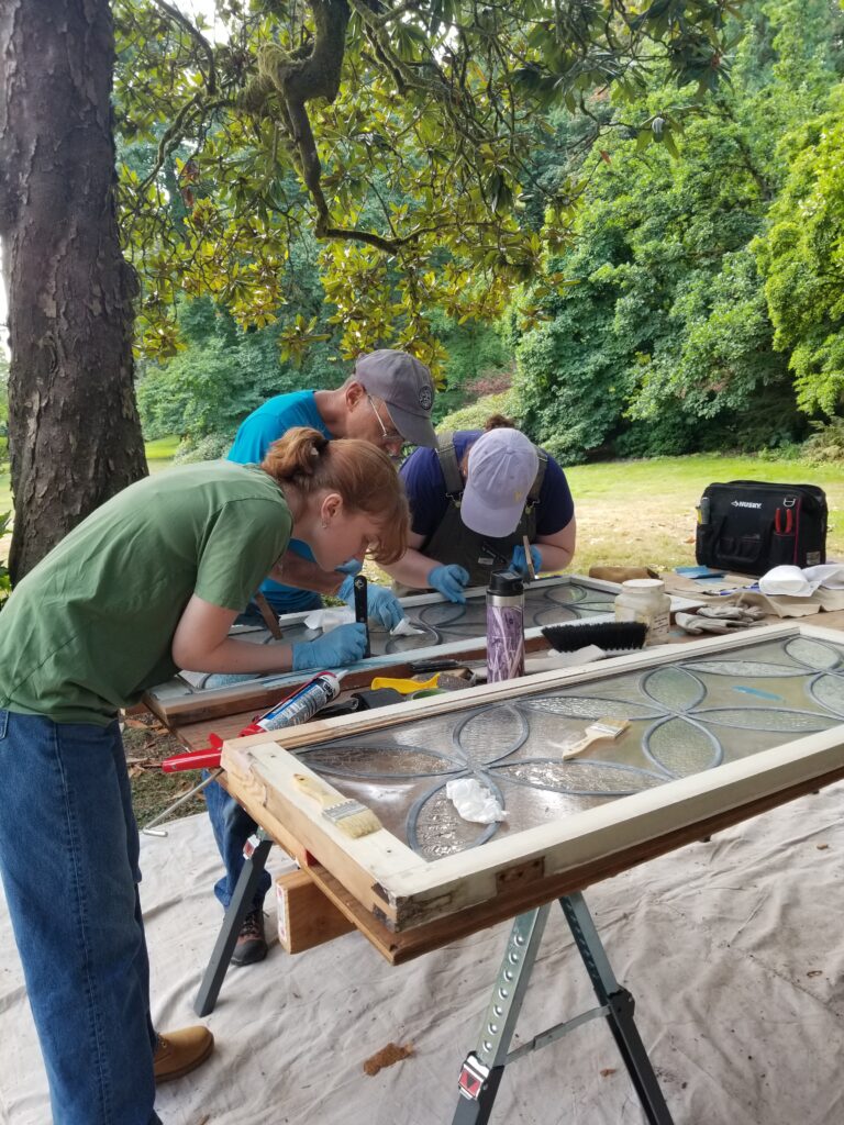 Stained Glass Restoration was led by David Schlicker of David Schlicker Stained Glass Studio, who has spent over 40 years creating and restoring windows for homes, businesses, and churches throughout the Pacific Northwest and beyond. Under his guidance, students completely rebuilt a damaged leaded glass window and stabilized the leading in our back door and chapel windows.