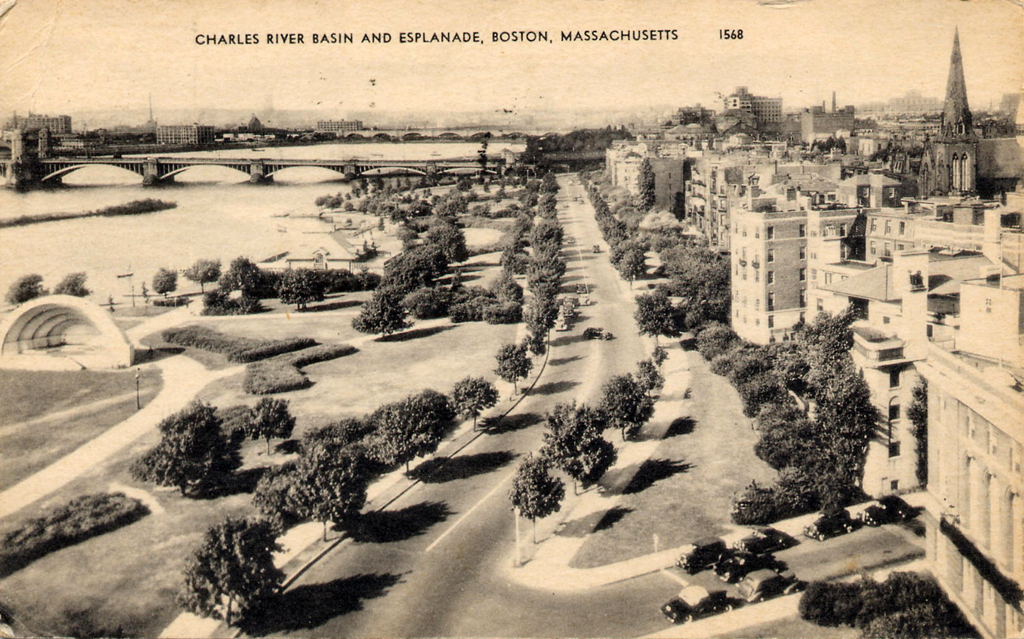 Charlesbank Park, located along the Esplanade, was designed by Frederick Law Olmsted in the 1880’s. Acting as the Beacon Street public entrance to the Back Bay Fens (00916), Olmsted planned a waterside park. Olmsted constructed a seawall between the embankment and river and designed a linear promenade to run along the northern edge of the 40-acre park.
