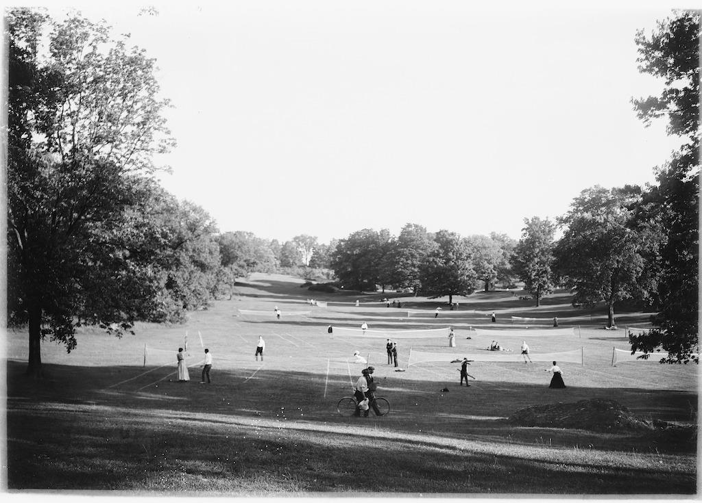 Making up more than twenty percent of Boston’s Park System in acreage, Franklin Park is the largest green space in the city. From its acquisition in 1875, the 527-acre landscape was envisioned as a grand ‘Country Park’. Detailing his vision, Frederick Law Olmsted wrote “The prime object will be to present favorably to public enjoyment a body of rural and sylvan scenery, large in scale, simple and tranquil in character; and, in contrast as to foil this, passages of a wild, rugged, picturesque, and forest-like aspect.” Olmsted and his son, John Charles, designed the park with several distinct sections. Each offering unique pastoral and rustic elements, the sub-areas include The Country Park, Ellicottdale, Schoolmaster Hill, The Wilderness, The Playstead, The Greeting, and Refectory. The Country Park Meadow was transitioned into a golf course in 1896.