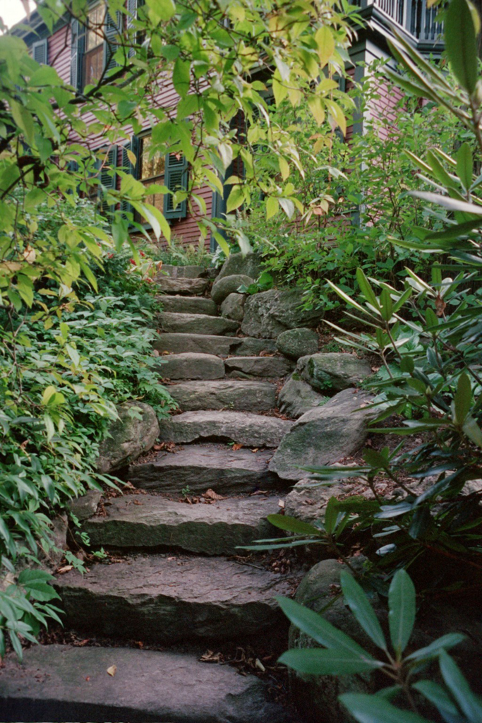 Although Fairsted was a relatively small property, the Olmsteds took advantage of every inch of space to showcase key Olmsted landscape design principles and elements— curvilinear paths, the balance of shadow and sun, layered plant material, borrowed views and sequencing. Fairsted sat adjacent to an open lawn which contrasted with the dense plantings near the house. Vines and evergreen shrubs covered the façade.