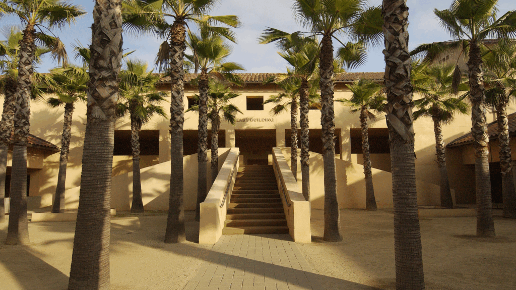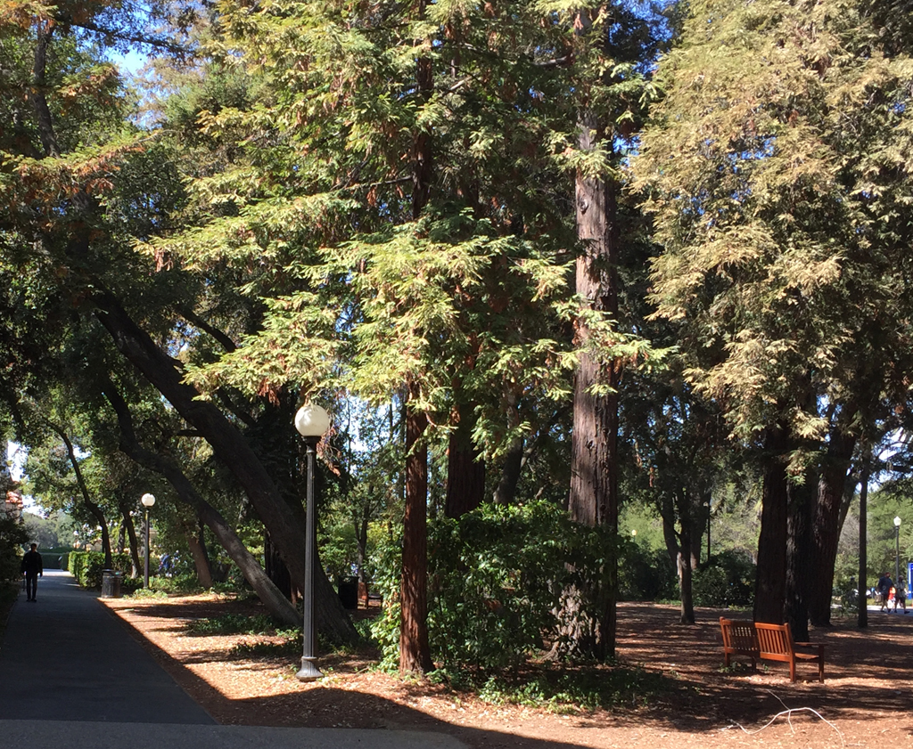 Olmsted’s plan included a ceremonial entry to the campus from the railroad and a series of quadrangles that could expand east/west surrounded by housing, all set in a ‘woods’ connecting to the foothills beyond. Plants were to be appropriate for the semi-arid climate and limited water resources of California, favoring natural beauty and color over annuals and decoration. Throughout the process Olmsted stayed committed to designing a sustainable campus, including native and drought resistant trees that are likely to endure the dry climate without excessive watering.